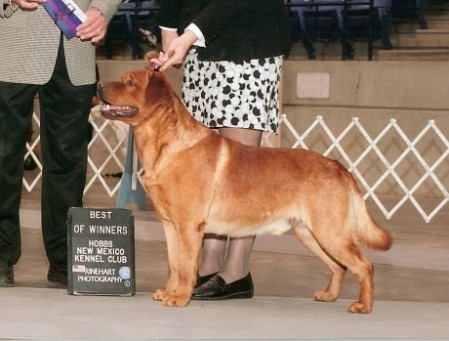 The problem in the United States is more difficult to overcome than in Europe for one main reason even though a Champion is much easier to make up in the US. Mainly as Mrs Barlow stated, it is a lack of education. In the United States it is overwhelming the number of dog shows going on in any one week. A quick look in the AKC Gazette shows 3-5 shows on any given Thursday, 5-10 on Fridays, 10-15 on Saturday and again on Sunday. This can equal on average 37 dog shows on any one week-end of the year. In Europe you generally only see one a week-end. In the UK most of the Labrador judges are breeders who have a much better handle on, not only what the breed should look like but a good knowledge of its history. In the United States the vast majority of the people that judge Labradors have never even owned one much less bred a Labrador Retriever. In fact a good percentage of our US judges have never bred a litter of any breed but were professional handlers. We have found most of the judges not only have never seen a fox red Labrador in fact some have to be reminded that it is in the Breed Standard. They are just not quite sure what to do when one shows up in the ring. Years ago speaking to Sally Kelley, she was telling me of a recent experience of hers where one of her dogs was disqualified for color, the level of ignorance is that bad. On Judy McCormick's web site she states, "There seem to be two types of people in the Labrador world; those who love fox reds, and those who hate them. At first it was a struggle to even get fox reds looked at in the show ring, but nowadays people are starting to come around and give the fox reds a fair shake. The previous statement is truer in terms of specialty (all Labrador) shows, than it is of all breed shows, but nonetheless the tide seems to be turning in favor of the reds. Much of the reason for this is that despite what people might want to do they can not disregard the breed standard." Judy is correct that at a Labrador Specialty a fox red is more likely to be judged on its merits versus an All Breed show. This difference can be explained very easily. While over the course of the year there might be 30 to 40 Labrador Specialty shows. At these shows you will find highly respected judges who are or have been Labrador breeders from both North America and abroad. They are very familiar with the standard and the history of the breed. With the vast numbers of All Breed Shows, a huge number of judges are required to cover these shows and the 150 some odd breeds all over the country. One cannot expect the level of knowledge and experience in our breed that you would in a Labrador Retriever only show. In addition, quite frankly I feel most All Breed judges are afraid to award points to a fox red Labrador not knowing how it will be perceived by others. The only way this can be overcome is for more fox reds to be exhibited in the show ring but there are so few quality ones being bred, I'm not overly optimistic this will happen Given the above, it is hard to imagine the accomplishment of Sally Bell's Keepsake Cajun overcoming all those odds and becoming only the second true fox red AKC Show Champion. I cannot think of a more deserving Labrador than Cajun. I saw Cajun at the age of 18 months at the Miami Valley Labrador Specialty in Dayton Ohio, what a stunning boy! A Labrador given his quality of any other color/shade would have finished quickly but even for Sally, it took her a while to gain acceptance of her red dog. While a red Labrador success's come